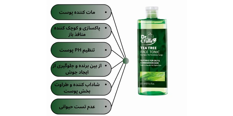 تونر ضدجوش تی تری حاوی روغن درخت چای دکتر سی تونا فارماسی با حجم 225 میلی لیتر و محصول کشور ترکیه، یکی از تونرهای موثر پوست است. این تونیک بعد از شستشو برای از بین بردن آثار باقی مانده از آرایش و ناخالصی ها که می توانند منافذ پوست را مسدود کنند استفاده می شود. تونر Dr. C. Tuna Tea Tree فارماسی پوست و منافذ آن را پاکسازی کرده و پوستی تمیز، شاداب و شفاف تر به شما می بخشد. این تونر حاوی روغن درخت چای بوده و میزان چربی پوست را نیز متعادل می کند.پیشگیری و درمان آکنه و جوش-پاکسازی پوست و منافذ آن-حاوی روغن درخت چای و متعادل کننده چربی پوست